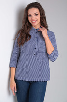 Блуза прямого силуэта. По центру полочки застежка в виде планки на миниатюрные пуговицы. Полочки с накладными карманами. Воротник отложной, рукав втачной, внизу обработан притачной манжетой с застежкой на пуговицы. Спинка с отрезной кокеткой, низ скруглен, в боковых швах небольшие разрезы.