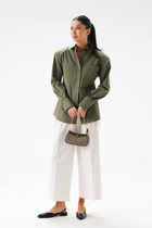 Блузка выполнена из атласа с абстрактным принтом. Застежка на потайную молнию в среднем шве спинки. Горловина округлой формы. Рукав одношовный. Блузка с плечевыми накладками.