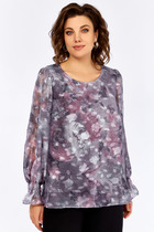 Блузка выполнена из гипюра с напылением серебристого цвета. Блузка полуприлегающего силуэта, длиной до линии бедер. По переду обработаны рельефы от плечевых швов до низа и центральная застежка до верха встык на пять навесных петель и пуговиц. На спинке обработаны талиевые вытачки. Горловина округлой формы, обработана воротником-стойкой. Плечевой шов укорочен. Рукав втачного покроя, одношовный, со сборкой по окату. Блузка декорирована притачной тесьмой по борту, низу и низу рукава.