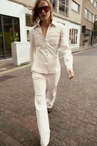 Блуза женская выполнена из гладкой струящейся ткани с сатиновым блеском. Горловина отложной воротник на стойке, рукав втачной длинный, по низу рукава расположена высокая манжета с застёжкой петли пуговицы. По переду изделия расположена потайная планка с застёжкой петли пуговицы. по спинке изделия расположены таллиевые выточки.
