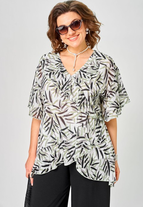 Блузка женская красивая стильная шикарная нарядная повседневная полуприлегающего силуэта расширенная к низу за счет воланов. На подкладке. Выполнена из легкого красивого шифона с трендовым принтом. Вырез горловины V-образный с воланами на обтаке, что скрывает все недостатки фигуры и делает образ легким и элегантным. Рукав втачной в виде волана, плечо спущенное. Низ блузы ассиметричный за счет воланов. Декором служит принт самой ткани и шифоны