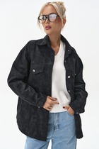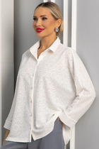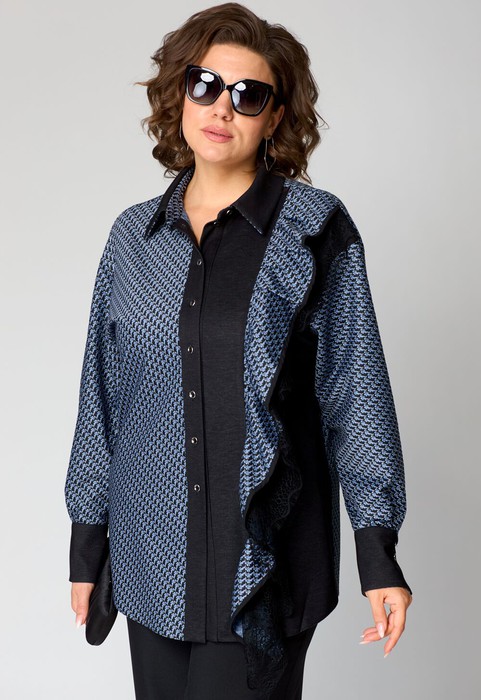 Блуза женская повседневная прямого силуэта, выполнена из трикотажного полотна двух дизайнов в сочетании с отделкой из кружева. Застежка доверху на петли и пуговицы, оротник на стойке рубашечного типа, плечо спущенное, рукав втачной по низу на притачной манжете. В боковх швах обработаны разрезы, с левой стороны по полочке притачная рюша из основной и отделочной ткани. Низ блузы фигурный. Декором блузы служат отделочные пуговицы и рюши.
