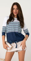 Блуза женская повседневная прямого силуэта, выполнена из трикотажного полотна двух дизайнов в сочетании с отделкой из кружева. Застежка доверху на петли и пуговицы, оротник на стойке рубашечного типа, плечо спущенное, рукав втачной по низу на притачной манжете. В боковх швах обработаны разрезы, с левой стороны по полочке притачная рюша из основной и отделочной ткани. Низ блузы фигурный. Декором блузы служат отделочные пуговицы и рюши.