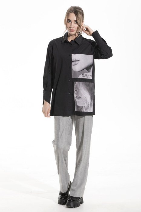 Блузка удлиненная, в стиле оверсайз, с втачным воротником с отрезной стойкой, центральной застежкой на петли и пуговицы. Спинка с отрезной кокеткой, встречной складкой по шву притачивания кокетки. Плечевые швы, переходящие на перед. Низ блузки фигурный. Рукав втачной, длинный, с отрезной манжетой.