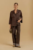 Блузка с отрезным воротником- стойкой, центральной застежкой на петли и пуговицы. На полочках расположены накладные карманы с клапанами. Плечо спущенное. Рукав втачной, 3/4 , с патой, закрепленной к рукаву петлей и пуговицей. По низу блузки- притачной пояс, присборенный на резинку.