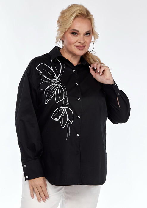 Блузка женская свободного силуэта, выполнена из хлопчатобумажной ткани. Воротник рубашечного типа, застежка центральная на петли и пуговицы. По переду дизайнерская вышивка. Спинка с кокеткой и встречной складкой. Рукава спущенные длинные, двухшовные, по низу заложены складки и обработан широкий манжет на две пуговицы. Низ фигурной формы.