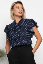 Эффектная нарядная блузка, выполнена из мягкого трикотажа с мерцающим эффектом. Такой дизайн ткани придает необычное переплетение нитей: с изнанки мягкий однотонный трикотаж! Вырез горловины мягкая стойка, переходящая в V-образный вырез с имитацией запаха. По полочке заложены декоративные складки для комфортного прилегания изделия. Низ блузки ассиметричный. Пояс декорирован задрапированным поясом из основной ткани, что зрительно стройнит и скрывает все недостатки фигуры. Рукав в точной, длинный. Спинка приталенная, без особенностей. К блузке предусмотрен съемная брошь, в виде цветка. Отлично сочетается с базовыми однотонными брюками из коллекции Лилиана.