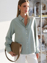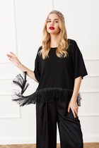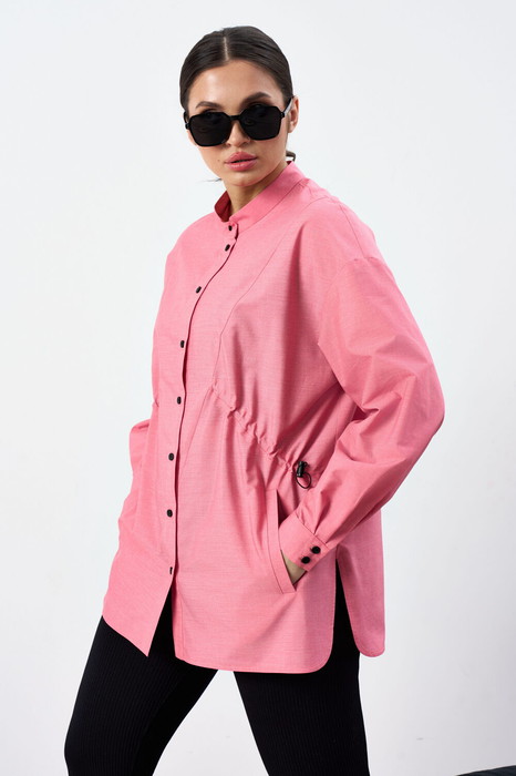 Блуза с воротником стойкой, спущенной линией плеча и центральной застёжкой на петли и пуговицы. Перед со сборкой на кулису с двух сторон и карманами в нижней части. Рукава втачные, с манжетами и пуговицами по низу.