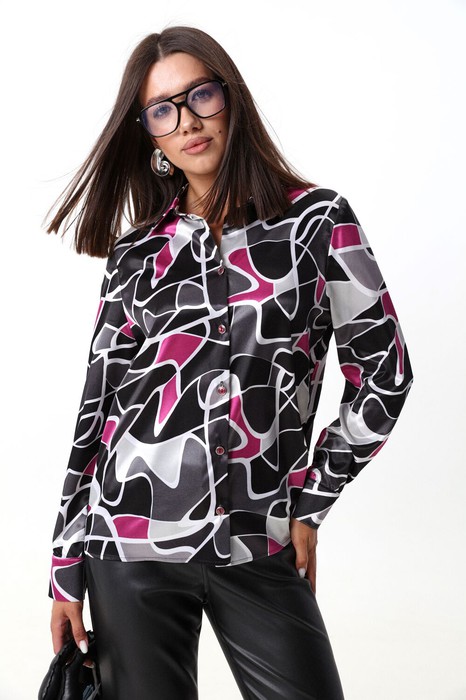 Блузка прямого силуэта с оригинальным принтом из лёгкой ткани с атласным мягким блеском. Воротник рубашечного типа, застежка на прорезные петли и пуговицы. В нижней части рукава заложены складки, манжета на двух пуговицах. Фурнитура и материалы отделки могут незначительно отличаться от тех, что на фотографии. Рост фотомодели 175 см. Размер у фотомодели – 44.