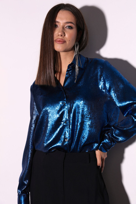 Блузка прямого силуэта из ткани с приятной к телу ткани с  вискозной изнанкой и блестящей лицевой стороной. Воротник рубашечного типа, застежка на прорезные петли и пуговицы. В нижней части рукава заложены складки, манжета на двух пуговицах. Рост фотомодели 175 см. Размер у фотомодели – 44. Длина блузы по спинке 64-68 см