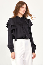 Блузка прямого силуэта с оригинальным принтом из лёгкой ткани с атласным мягким блеском. Воротник рубашечного типа, застежка на прорезные петли и пуговицы. В нижней части рукава заложены складки, манжета на двух пуговицах.