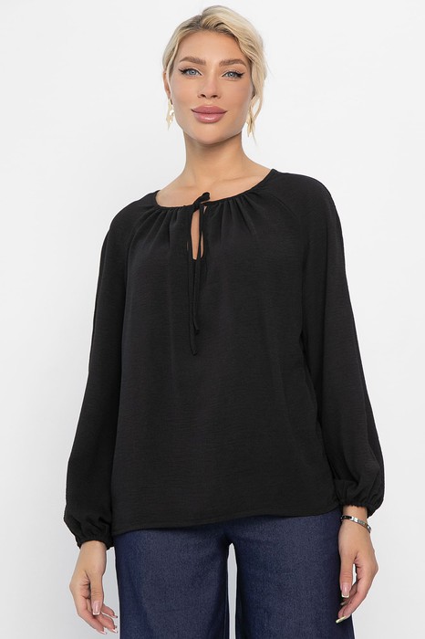 Легкая и воздушная блуза свободного силуэта, выполненная из приятной к телу ткани. Такая модель блузы хорошо будет сочетаться как с джинсами, так и с классическими брюками и юбками. Блуза обеспечит Вам комфорт и свободу движения. Вырез капелька на завязке и длинный рукав придают модели элегантность.