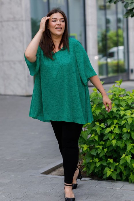 Женственная туника свободного силуэта из шифона в принт на трикотажной подкладке. V- образный вырез горловины по переду обработан внутренним швом. Втачной широкий рукав, длиной до линии локтя. Низ прямой. Низ изделия и рукавов обработаны ролевым швом.Туника составит гармоничный комплект узким брюкам. Замечательный выбор для создания комфортных и стильных образов.