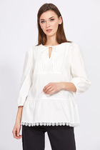 Блуза прямого силуэта из шифоновой ткани с вышивкой. Горловина округлая, на спинке застежка на петлю и пуговицу. По переду кокетка, от кокетки сборка. Рукав втачной удлиненный, по низу волан собранный на резинку.