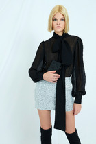 Нарядная блузка из атласной ткани. На полочке складки, небольшой V-образный вырез и декоративная стойка. Спинка со средним швом и застежкой на молнию. В боковых швах по низу разрезы