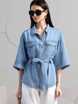 22.03 Vilatte Удлиненная блузка с поясом и карманами из джинсового лиоцелла D59