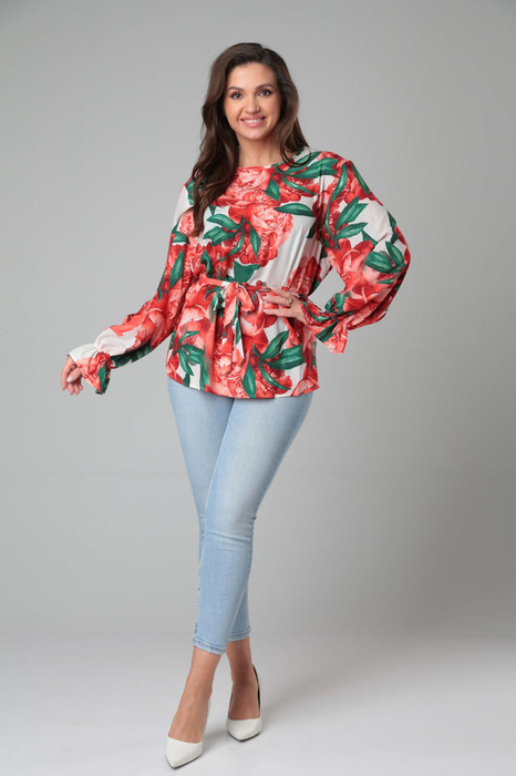 Блузка свободного кроя. Полочка с нагрудными вытачками. Горловина и разрез на застежку по спинке обработан косой бейкой из основной ткани, разрез с навесной петлей на пуговицу. Рукав прямой, длинный, втачной, со сборкой на эластичную ленту в 8см от края рукава. По линии талии на боковых швах настрочены шлевки и вдет пояс из основной ткани. Низ изделия фигурный с разрезами в боковых швах.