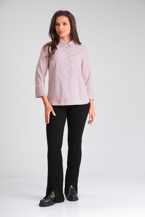 Блузка женская c рубашечным воротником, свободного силуэта. Полочка и спинка изделия, горизонтально разрезные на косую. Верхняя часть полочки с нагрудными вытачками, накладным карманом на левой части и цельнокроеной планкой на застежку. Рукав прямой, втачной с широкой манжетой на отворот. Низ изделия фигурный с разрезами по боковым швам, обработан широкой обтачкой.