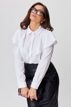 Женская блузка с V-образным вырезом. Модель c воротником стойкой. Рукав втачной длинной за локоть и шнуровкой-стяжкой. Передние полочки блузы с нагрудными вытачками. По спинке планка с застежкой на пуговицы.
