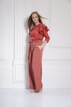 Блуза прямого свободного кроя с округлым вырезом горловины с декоративной нашивкой. По переду две отлетные складки в рельефе. Рукава втачные длиной три четверти. По низу изделия притачной волан из трикотажного гофре.