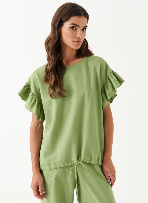 Блуза женская из льняной ткани для повседневной носки. Горловина круглая, пройма оформлена сборкой. По низу изделия кулиса.