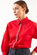 Детали: прямой силуэт, высокий воротник стойка с широкими длинными завязками, блуза с глубокой складкой по переду, удлинённая линия плеча, рукава с притачными манжетами и застёжкой на пуговицу.