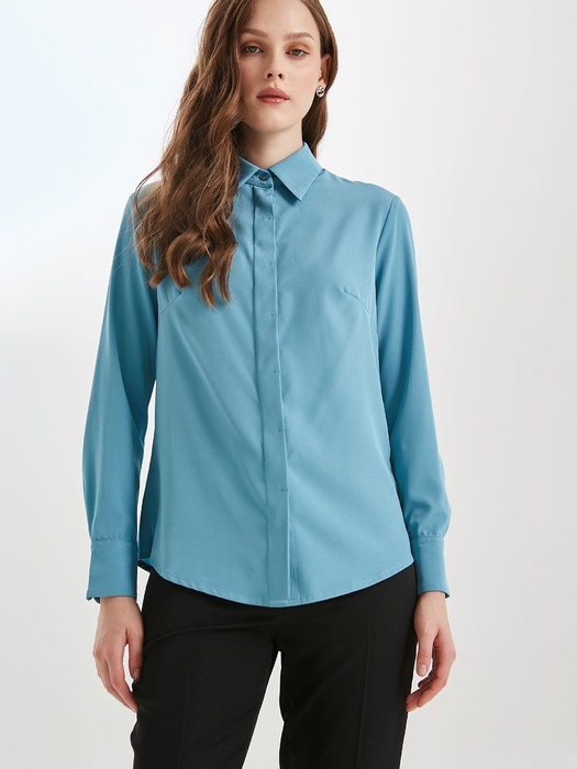 Модель прямого силуэта. Спереди потайная застёжка на петли и пуговицы. Спинка с кокеткой, под кокеткой защипы. По низу рукава окантованный разрез, защип и фигурная притачная манжета с застёжкой на петли и пуговицы. Воротник сорочечный. Низ блузки фигурный. В боковых швах разрезы.