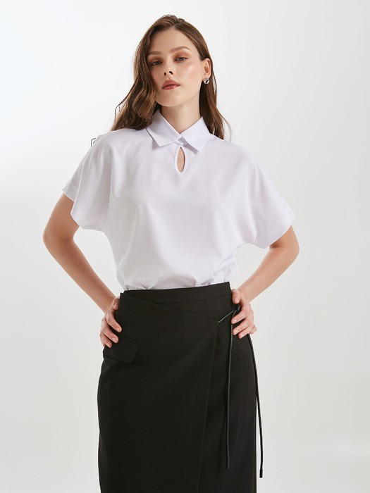 Модель прямого силуэта. Спереди окантованный вырез и застёжка на пуговицу на стойке. Воротник сорочечный. В боковых швах небольшие разрезы.