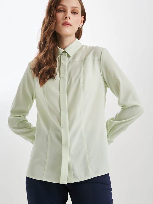Спереди кокетки и рельефы. Сзади под кокеткой защипы. По низу рукава защипы, шлица и манжета с застёжкой на пуговицы.