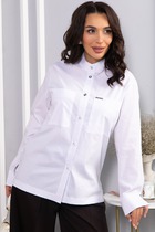 Модель полуприлезающего силуэта, с фигурной линией низа. Спереди центральная потайная застёжка на петли и пуговицы. Воротник сорочечный. По низу рукава кулиса с завязками и волан.