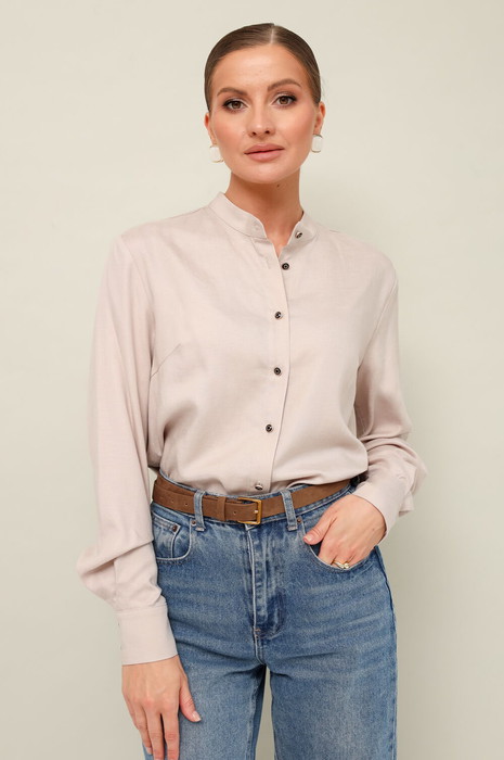 Стильная и комфортная блузка, выполнена из натуральной вискозной ткани. Блузка прямого кроя, горловина со стойкой, центральная застежка на петли и пуговицы. Рукава втачные с манжетами с застежкой на пуговицы. В боковых швах обработаны высокие разрезы.
