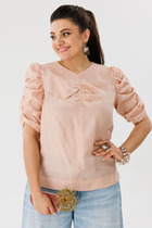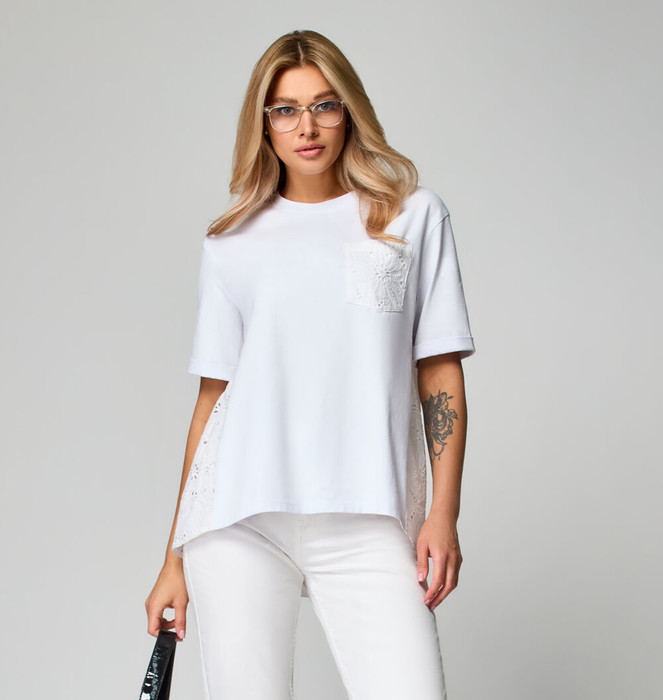 Блузка женская расширенная к низу с втачным спущенным рукавом. Горловина обработана бейкой. По левой части переда накладной карман. Спинка с кокеткой в верхней части, нижняя часть спинки из двух деталей со сборкой. Линия бокового шва спинки слегка смещена на деталь переда. Рукав короткий с отворотом.  Нижняя часть спинки и накладной карман выполнены из хлопка «шитье».