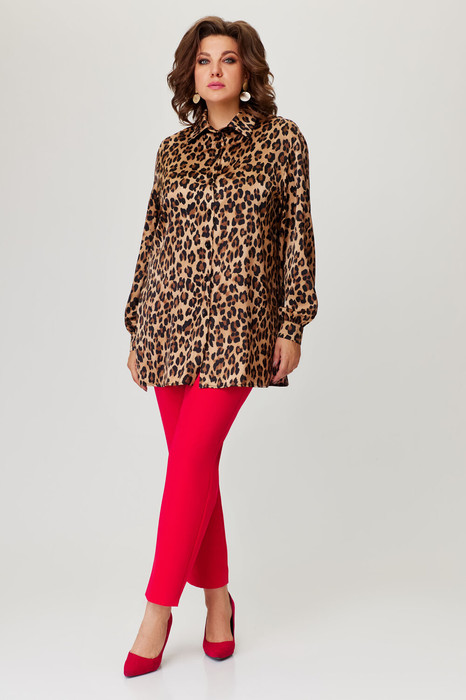 Блузка женская прямого силуэта, с втачным рукавом. Линия плеча слегка спущена. Застежка центральная на 8 петель и пуговиц. По горловине отложной воротник на стойке. Спинка с кокеткой и встречной складки из-под кокетки. Рукав длинный со сборкой по низу, на манжете с застежкой на петлю и пуговицу. В боковых швах обработаны разрезы.