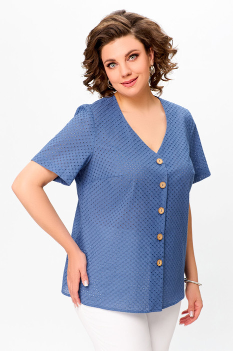 Блузка женская, прямого силуэта из хлопчатобумажной лёгкой ткани «ришелье». Застёжка центральная на петли и декоративные пуговицы. По переду блузы обработаны нагрудные выточки. Спинка цельнокроеная.  Горловина с V-образным вырезом. Рукав втачной короткий.