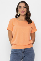 Блузка из мягкой вискозной ткани свободного силуэта со спущенной линией плеча. Горловина по полочке округлой формы, по спинке – V-образный вырез, который соединён планкой. Рукав втачной, длинный. Низ блузки и низ рукавов присобраны на декоративный трикотажный довяз.