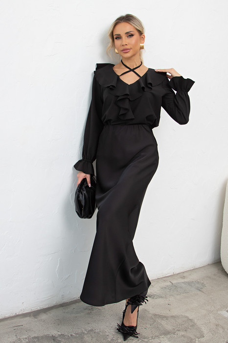 Женственная блузка прямого кроя из плательно-костюмной ткани. V-образная горловина оформлена по переду воланом и дополнена тесьмой, которую можно элегантно повязать вокруг шеи. Длинный втачной рукав по запястью присобран на резинку. Низ ровный, без разрезов.