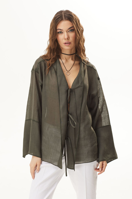 Блузка-трансформер (предполагает два варианта: с застежкой по переду и с застежкой по спинке). Блузка свободного кроя из льняной ткани. Застежка в виде завязок. Рукава прямые, по низу рукава манжета с разрезом.