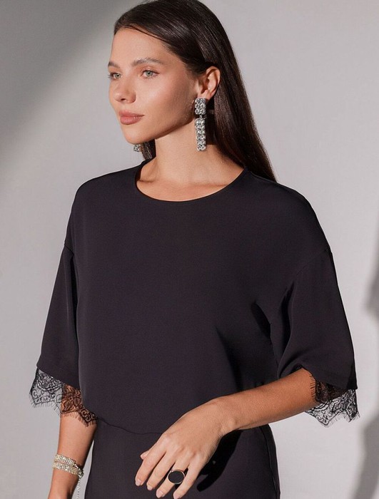 Свободная блузка черного цвета из креп-шифона отличается изящным кроем и особым вниманием к деталям. Блузка с круглым вырезом и спущенной линией плеча создает элегантный образ, идеально подходящий для делового дресс-кода или праздничного мероприятия. Натуральная ткань обеспечивает приятное и комфортное ощущение на теле, позволяя коже дышать в течение всего дня, сохраняет форму и презентабельный вид даже после длительного ношения. Широкие рукава свободно струятся, подчеркивая нежную текстуру материала и придавая образу легкость. Блузка идеально подойдет на большие размеры, в ней вы будете чувствовать себя уверенно. Особый акцент сделан на кружеве на рукавах, которое добавляет стильной блузке изящности и подходит для различных случаев.
