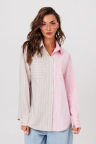 Отделочным элементом блузки является 5 цветков, настроченные пуговицами.