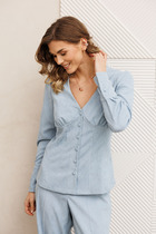 Базовая блузка из шифона, свободного кроя. Рукав длинный, втачной, с резинкой по низу. Особую оригинальность этой блузке придает бант на горловине. Эту нарядную блузку можно комбинировать и с юбкой, и с брюками.