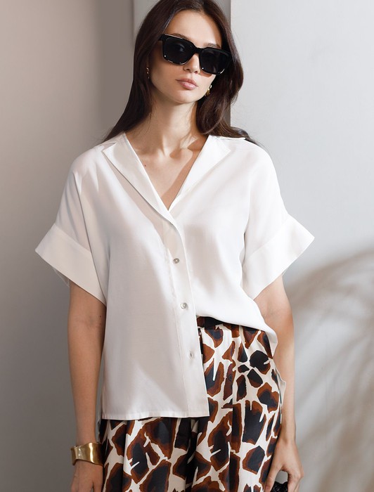 Состав: 55%Вис 45%Лиоцелл (Вис) Плотность: 115 Г/м2Блузка натурального белого цвета сочетает в себе комфорт и элегантность благодаря материалу из вискозы с лиоцеллом. Аккуратный отложной воротник подчеркивает утонченность образа, а широкие короткие рукава привлекают внимание и делают силуэт современным. Спущенная линия плеча формирует расслабленный, но стильный внешний вид, что идеально для тех, кто ценит индивидуальность и уверенность в деталях. Крой продуман так, чтобы подчеркивать достоинства фигуры и на больших размерах, создавая гармоничный силуэт без лишних усилий. Ткань из вискозы с добавлением лиоцелла обеспечивает приятные ощущения и отличную посадку, струится на теле и охлаждает в жаркую погоду. При пошиве использована технология «чистый край» по всей длине центральной планки и низу изделия. Это признак премиум качества — «чистый край» вместо оверлока. Блузку можно носить с топом, не застегивая — при этом распахнутая блузка будет выглядеть максимально эстетично. Рубашка легко впишется как в деловой гардероб, так и в повседневный стиль, позволяя выглядеть безупречно независимо от ситуации.