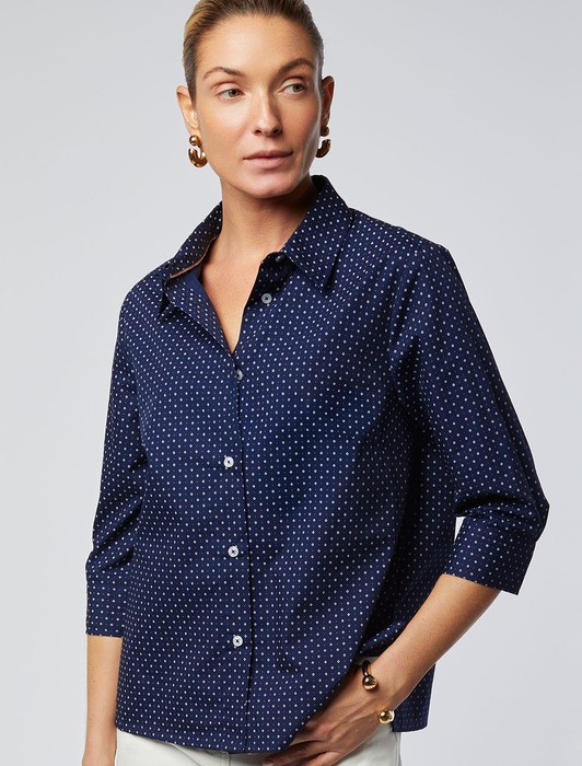 Состав: 65%Хлопок 35%ПЭБлузка прямого кроя выполнена из хлопка. Модель с укороченным рукавом и застежкой на пуговицы из натурального перламутра. Хлопковая ткань отлично держит форму, а добавление ПЭ в составе способствует меньшей сминаемости изделия. На спинке фирменный логотип бренда золотистого цвета.