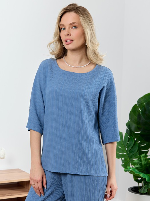 Блуза женская из гладкокрашеного тканого полотна, прямого силуэта, с горловиной овальной формы и цельнокроеными рукавами длиной до локтя. Горловина окантована основным материалом.При выборе изделия в белом цвете идеальным решением будет выбор белья нейтральных