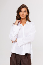 Блуза (рубашка) женская из тканого синтетического полотна с набивным рисунком, свободного покроя, с V- образным вырезом горловины, короткими втачными рукавами, центральной бортовой застежкой на обметанные петли и пуговицы. В боковых швах разрезы, по низу рукавов манжеты, горловина обработана обтачкой.