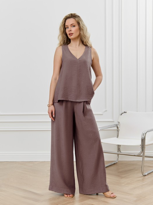 Блуза -топ из гладкокрашеного фактурного полотна средней длины, расширенный книзу, с горловиной v-образной формы. Полочка и спинка - со средними швами. Горловина и проймы окантованы основным материалом, низ изделия обработан подгибкой.