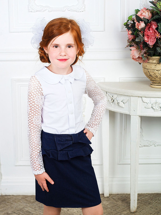 Блузка с закругленным  воротничком и бантом . Длинный рукав из гипюра .Рекомендована для школы.