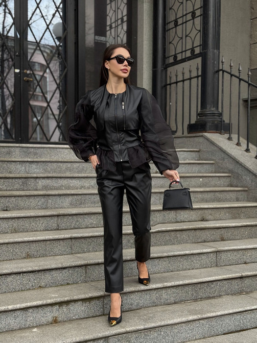 Бомбер приталенного силуэта, обработан подкладкой. Отрезной по линии талии, декорирован баской из органзы. Рукава длинные втачные, двойные: внутренняя часть выполнена из экокожи, внешняя обработана органзой, присборенной для пышности. Низ изделия обработан баской, собранной в складку. Перед обработан отлетными кокетками, растегиваются на разъёмные молнии. Застёжка — разъёмная молния по центру переда лифа, по низу вшиты шлёвки и съёмный пояс из основной ткани, дополнен металлической пряжкой.