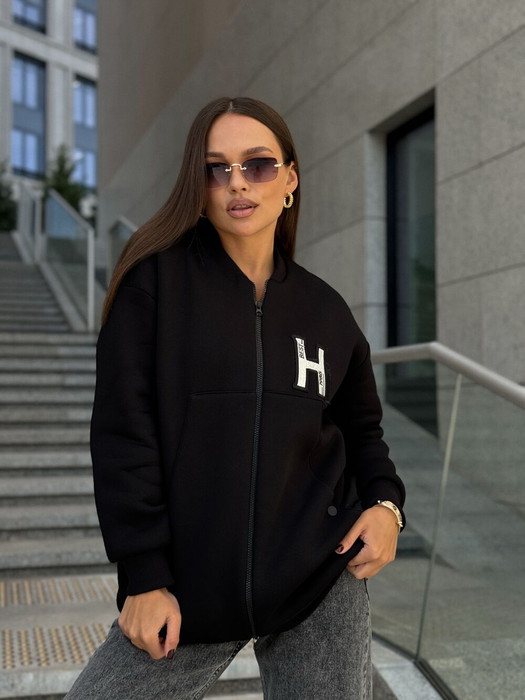 Бомбер женский, прямого силуэта, со спущенной линией плечевого шва, выполнен из трикотажного утепленного полотна. Спинка без конструктивных особенностей.