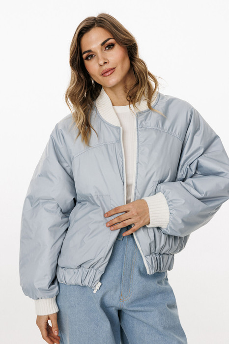 Куртка выполнена из плащевой ткани с утеплителем Isosoft. Куртка О-образного силуэта, длиной выше линии бедер. Куртка двусторонняя. Спереди застежка на молнию и карманы. Рукав покроя кимоно переходящий в кокетки спереди и по спинке. Низ рукава на притачной манжете из трикотажного довяза. Горловина округлой формы с вортником-стойкой из трикотажного довяза. Низ куртки на притачном поясе с эластичной тесьмой внутри. Одна из сторон куртки декорирована на спинке нашивкой из натуральной кожи.