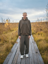 Брюки мужские спортивные. Боковые карманы и карман сзади на молнии. Спереди, около кармана небольшой принт в виде надписи. По боковому шву однотонные лампасы. Низ на манжетах.